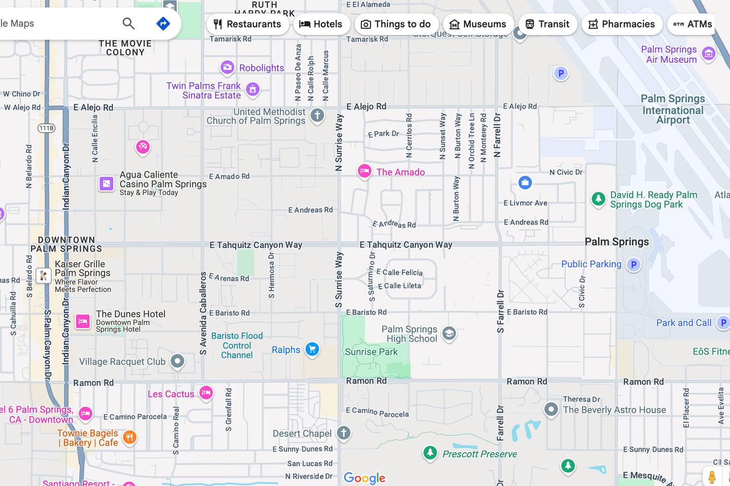 Sunmor estates is centrally located 1.5 miles away from downtown 1.0 miles from the grocery 0.8 miles from Farmers Market 0.7 miles from Palm Springs International Anything you need is accessible by a leisurely walk, short bike ride, or quick car trip