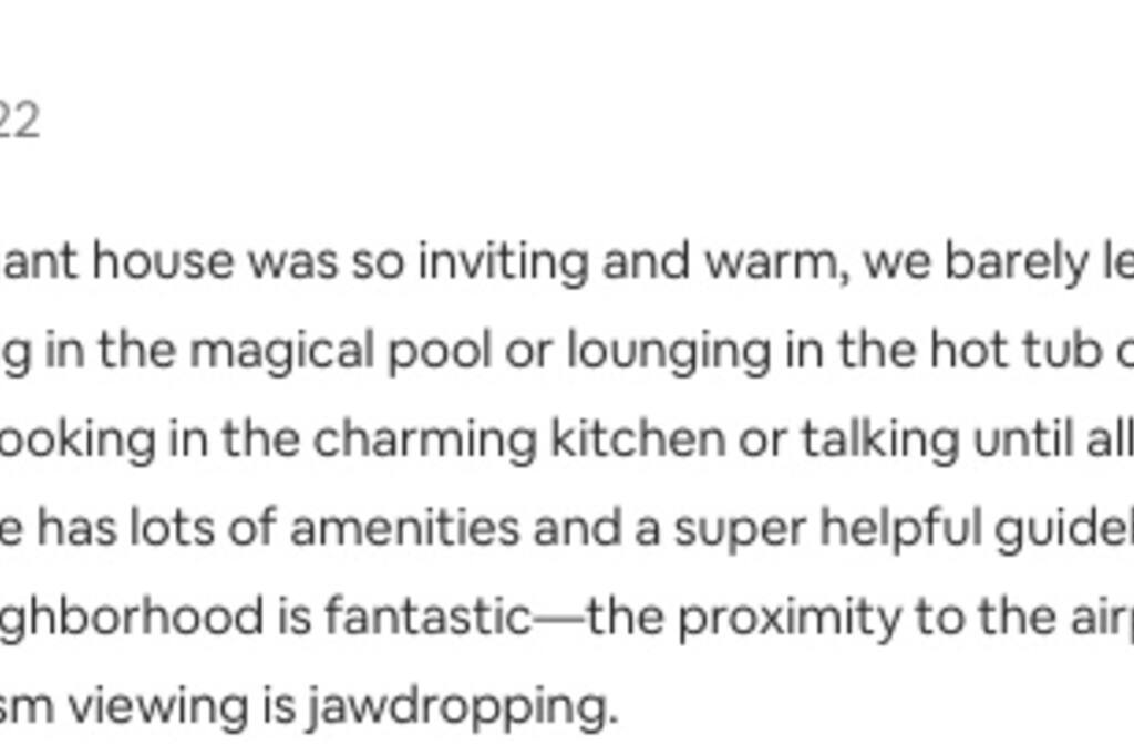 Space: ⭐️⭐️HIGHLIGHTS ⭐️⭐️ * 10 people = 8 adults & 2 children under 12 ✹ 4 bedrooms; 2 California kings, 1 queen, 2 twins, 1 full size futon ✹ 2 full bathrooms w/ complimentary toiletries ✹ Family-friendly ✹ Full kitchen; stainless steel appliances ✹ Open-concept layout ✹ Stylish living area ✹ Workout area w/ a treadmill, water rower, and adjustable weights ✹ Free high-speed wifi + Smart TVs ✹ Central A/C + heating ✹ Game console ✹ Washer + dryer ✹ Dog-friendly ✹ Stunning mountain views ✹ Private backyard w/ shaded seating areas ✹ Large heated saltwater pool + hot tub ✹ Fire pit ✹ BBQ + outdoor dining table ✹ Outdoor games ✹ 6 beach cruisers w/ locks and helmets ✹ Home Gym w/ Peloton Bike, rower , weights and more ✹ Free parking ✹ Prime location; short drive to airport, downtown, attractions, groceries + restaurants ✹ Concierge service; car rentals, chef recommendations, airport pickups + more Eager to Read More? Here Are A Few Kind Words From Our Previous Guests: “We really enjoyed our stay. So many amenities were available in the home, a thorough guide was provided to answer any questions, check in went smoothly. Would definitely recommend and will try to return. Pool and spa were GREAT!” - K “Look no further for your memorable Palm Springs getaway. The backyard is like having your own private resort! Location to all the hotspots makes this place an easy landing spot for coming and going. The owners and management company was very friendly and happy to help with making your stay easy and comfortable. The home is well equipped and has a beautifully organized manual to help answer any questions you may have with the home. Would highly recommend!❤️” - Christina “I have nothing but good things to say about this place! It was perfect for my 30th birthday. Located 3 minutes from the airport, it is cozy, clean, and was fully stocked with anything we could’ve needed. The saltwater pool is AMAZING and we felt very at home all weekend. Would totally stay again!” - Jasmine ★★ BEDROOMS ★★ Built in 1960 by the Alexander Building Company and designed by architect William Krisel, Sunmor Escape has been renovated with modern conveniences while retaining its original charm. This charm is fully on display in each of the four spacious bedrooms. Each with a different color scheme and lovely design, ensuring a unique place to unwind. The plush mattresses are fitted with Egyptian cotton sheets and the windows feature room-darkening shades so you can enjoy a restful sleep. ✹ Primary bedroom: California king bed, Smart TV, workout room, direct access to the backyard, ensuite bathroom ✹ Second Primary Bedroom: California king bed, futon, Smart TV, direct access to the backyard, work desk ✹ Third Guest Room: Queen-sized bed, work desk ✹ Fourth Guestroom: Two twin beds can be converted to Cali -King with notice ★★ BATHROOMS ★★ Freshen up in one of the 2 full bathrooms. Each elegant bathroom is sparkling clean and offers an inviting space in which to freshen up. ✹ Bathroom 1: Ensuite to primary bedroom, walk-in shower, single vanity ✹ Bathroom 2: Walk-in shower, single vanity ✔ Fresh towels ✔ Shampoo, conditioner, and body wash ✔ Hair dryer ✔ Washer and dryer ✔ Iron ★★ KITCHEN & DINING ★★ The state-of-the-art kitchen is the perfect place to whip up delicious meals for the whole group. You’ll find everything you’ll need during your stay, including high-end appliances, plenty of counter space, and ample cookware and dishware. You’ll even find a Margaritaville Concoction Maker so you can easily blend a margarita to enjoy outside on a hot summer day. The open-concept layout makes it easy to socialize while preparing meals. ✔ Stainless steel appliances ✔ Full-size fridge and freezer ✔ Dishwasher, stove, oven, and microwave ✔ Keurig coffee maker, kettle, blender, air fryer ✔ Waffle maker, air fryer, popcorn machine, Margaritaville Frozen Concoction Maker ✔ Kitchen island with seating for 2 ✔ 8-foot mid-century tulip dining table for 8 ✔ Cocktail bar ★★ LIVING ROOM ★★ Relax in the spacious living area. You’ll find a large sectional sofa for 8 and two reclining chairs, perfect for accommodating large groups. Sit back and watch your favorite show after a wonderful day of golfing or lounging by the pool. ✔ 55” Flat-screen Smart TV with Amazon Prime Video, Disney+, HBO Max, Hulu, Netflix, Roku, a DVD player, and standard cable ✔ Free wifi (30Mbps) ✔ Game console ✔ Central A/C ✔ Board games ★★ OUTDOOR SPACE ★★ Step outside into the private backyard and enjoy some fresh air and lovely mountain views. Take a dip in the saltwater pool or soak in the spa (heated free of charge). There are plenty of pool floaties, towels, and lounging areas. Enjoy playing outdoor games, grill up a meal on the BBQ, and enjoy an al fresco meal at the outdoor dining table (made easier thanks to a pass-through window from the kitchen). ✔ 500-square-foot saltwater pool and hot tub (free heating for spa) ✔ BBQ and outdoor seating ✔ Outdoor games; Connect Four + Giant Corn hole ✔ Sun loungers ✔ Hammock ✔ Firepit ✔ 2 beach cruisers w/ helmets + lock ★★ ACTIVITIES/ATTRACTIONS ★★ This charming home is ideally located in a quiet neighborhood near many fun activities. Whether you’re traveling with friends or family, you’ll have endless opportunities at your fingertips. Check out some of these fun things to do: ✔ Palm Springs Aerial Tramway: Elevate your family's vacation at the Palm Springs Aerial Tramway, providing breathtaking views as you ascend to the mountain station, where hiking trails and panoramic vistas await. ✔ Palm Springs Art Museum: Unite with friends for a cultural experience at the Palm Springs Art Museum, showcasing a diverse collection of contemporary and classic art, perfect for a group outing of artistic exploration. ✔ Palm Springs